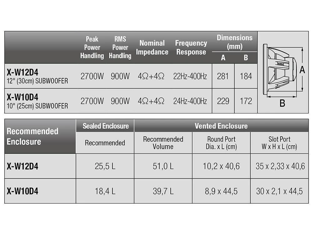 X-W10D4 – 25 cm (10-Zoll) X-Series Subwoofer (4 Ohm + 4 Ohm)