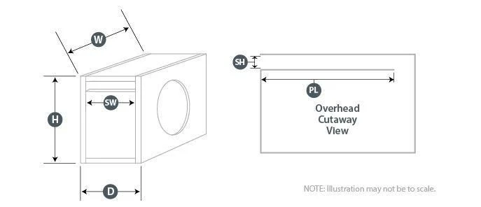 * Bei den oben aufgeführten Empfehlungen für die Gehäuse handelt es sich um Außenmaße, bei denen Material mit einer Dicke von 19 mm (19 mm) verwendet wird. Wenn Sie Material mit einer Dicke von 0,625 Zoll (16 mm) verwenden, ziehen Sie 0,25 Zoll (6) von jeder Abmessung ab. Verwenden Sie kein Material mit einer Dicke von weniger als 16 mm, da dies die Steifigkeit des Gehäuses beeinträchtigen kann.