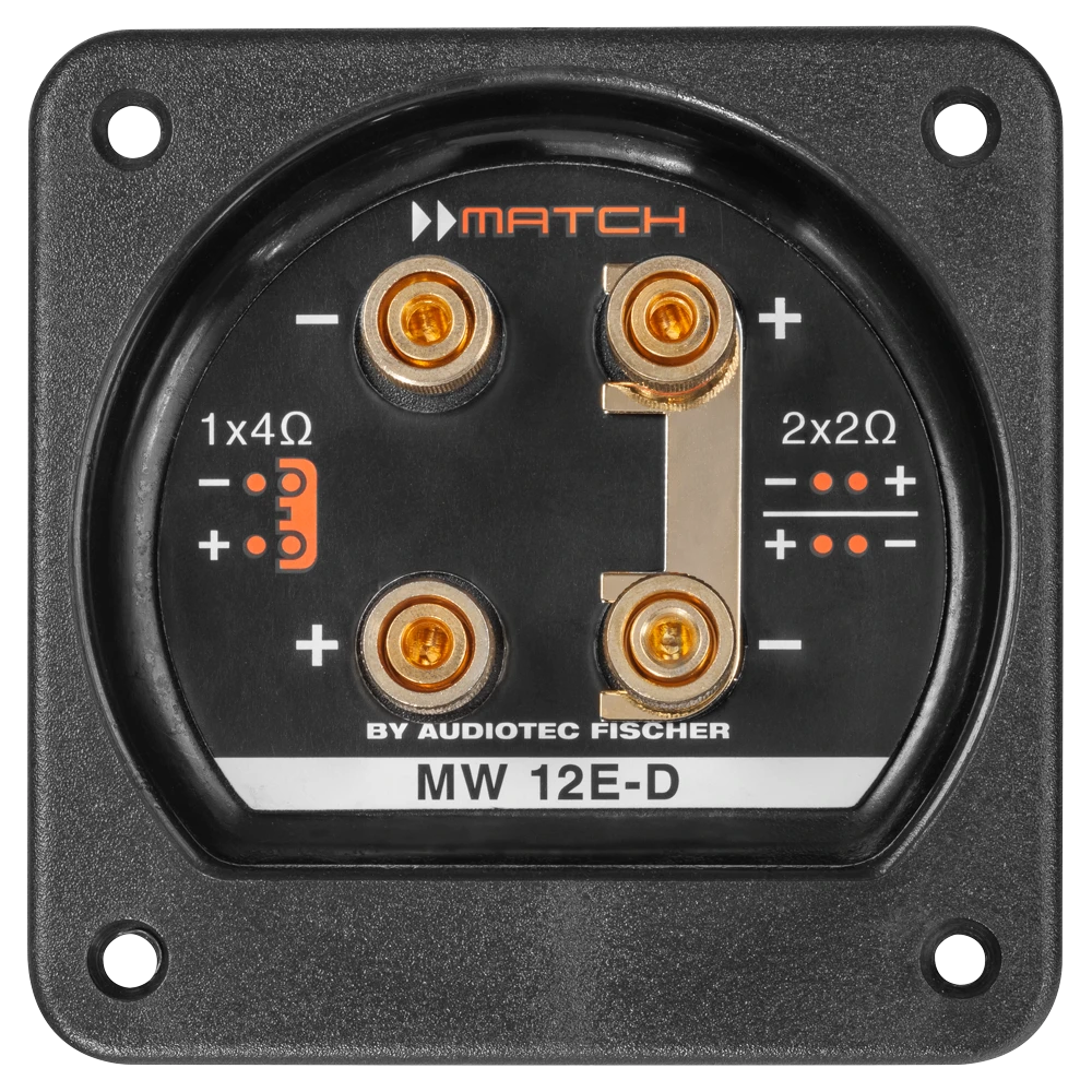 - Schwingspulenkonfiguration über Anschlussterminal wählbar – 2 x 2 Ohm oder 1 x 4 Ohm