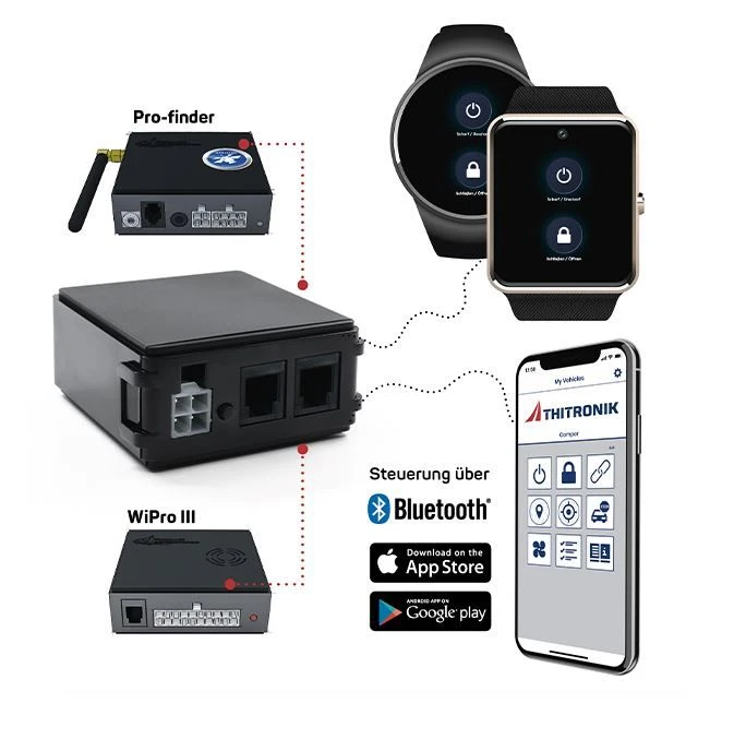Zusammenführen, was zusammen gehört. Ab 2020 bietet Ihnen THITRONIK einen raffinierten Baustein zum Optimieren des THITRONIK-Sicherheitssystems an: Das Vernetzungsmodul. Dieses Modul koppelt via App und Bluetooth im Nahbereich des Reisemobils das Smartphone mit der ðWiPro III-Alarmanlage. Von nun an können berechtigte Nutzer jederzeit bequem scharf oder unscharf schalten. Besitzern einer WiPro III safe.lock, die auch auf die vorhandene Zentralverriegelung zugreift, ist das Öffnen und Schliessen des Fahrzeuges ohne Fahrzeugschlüssel und Handsender möglich.